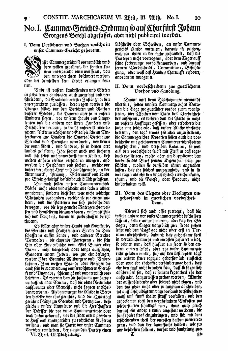 Es sollen aber vnsere Haubt vnd Amptleute, die Gerichte vnd Rathe vnserer Stedte die Herschafftenn auffm Lande, vnd anderer Gerichte Verwalter, die clagende Parteyenn, die sein Ein oder Außlendische vom Adel Burger oder Pawr, nicht vorgeblich oder lange auffziehen, Sondern einem Jeden, wo zue ehr befuegtt, wieder Jhre Beambte Mitburgere vnd Vndersaßenn, Jnn wessen Stande oder Ansehen die auch sein bei vormeidung vnnserer schweren Straffe vnd Vngnade, schleunigk vnd vnparteylich vorhelffenn, Es werenn dan die sachen so gantz zweiuelhafftich oder Vnclar, daß die ohne Rechtliche außfurunge oder Beweiß, nicht konten entscheiden werdenn, Alßdan muegen die Raͤthe in Stedten dieselbe vor ihre gerichte, vnd die Quarthal gerichts Raͤthe zue Stendal vnd Prentzlaw, deßgleichen vnsere Amptleute vnd die Herschafften der Doͤrffer die vor vnser Cammergerichte oder waß dahin gehorigk, vor die jeder ortts geordente Hoff vnd Landtgerichte zu rechtlichen Außtrag weisenn, vnd wan sie Partt vor vnser Cammer-Gerichte remittiren, der clagenden Partey einen [Sp. 10] Abscheidt oder Schreiben, an vnser Cammer-gerichts Rathe mitteilen, darauß sie zusehen, waß vor ihnen in der sache gehandelt, daß die Parteyen nicht vortragenn, oder dem Cleger auff seine forderunge vorholffen worden, vnd darauf fernern Vorbescheidt, Commission, Besichtigung, oder waß deß Handels Notturfft erfodert, anordnenn muegenn.