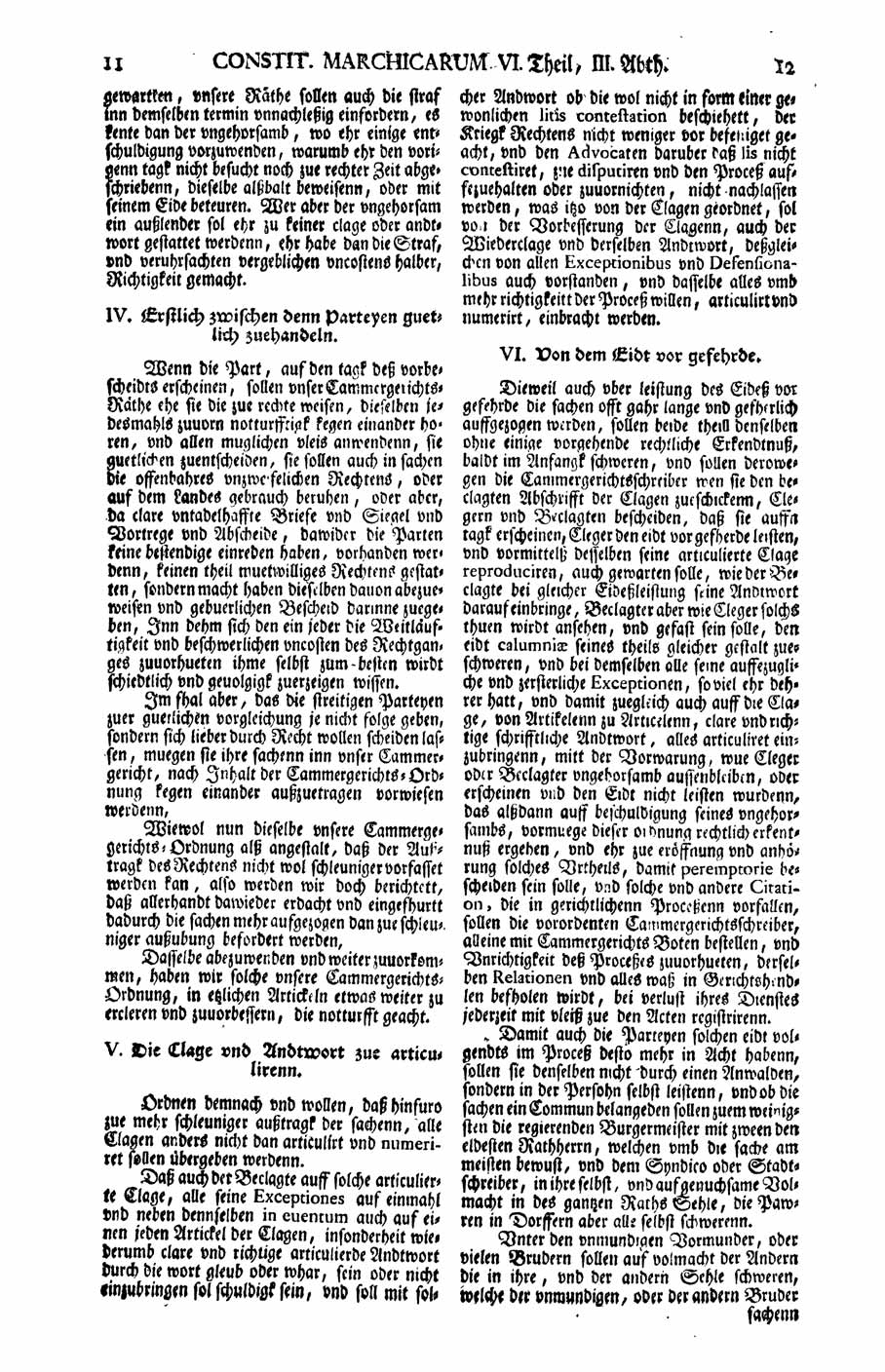 Daß auch der Beclagte auff solche articulirte Clage, alle seine Exceptiones auf einmahl vnd neben dennselben in euentum auch auf einen jeden Artickel der Clagen, insonderheit wiederumb clare vnd richtige articulierde Andtwort durch die wort gleub oder whar, sein oder nicht einzubringen sol schuldigk sein, vnd soll mit [Sp. 12] solcher Andwort ob die wol nicht in form einer gewonlichen litis contestation beschiehett, der Kriegk Rechtens nicht weniger vor befestiget geacht, vnd den Advocaten daruber daß lis nicht contestiret, zue disputiren vnd den Proceß auffzuehalten oder zuuornichten, nicht nachlassen werden, was itzo von der Clagen geordnet, sol von der Vorbesserung der Clagenn, auch der Wiederclage vnd derselben Andtwort, deßgleichen von allen Exceptionibus vnd Defensionalibus auch vorstanden, vnd dasselbe alles vmb mehr richtigkeitt der Proceß willen, articulirt vnd numerirt, einbracht werden.
