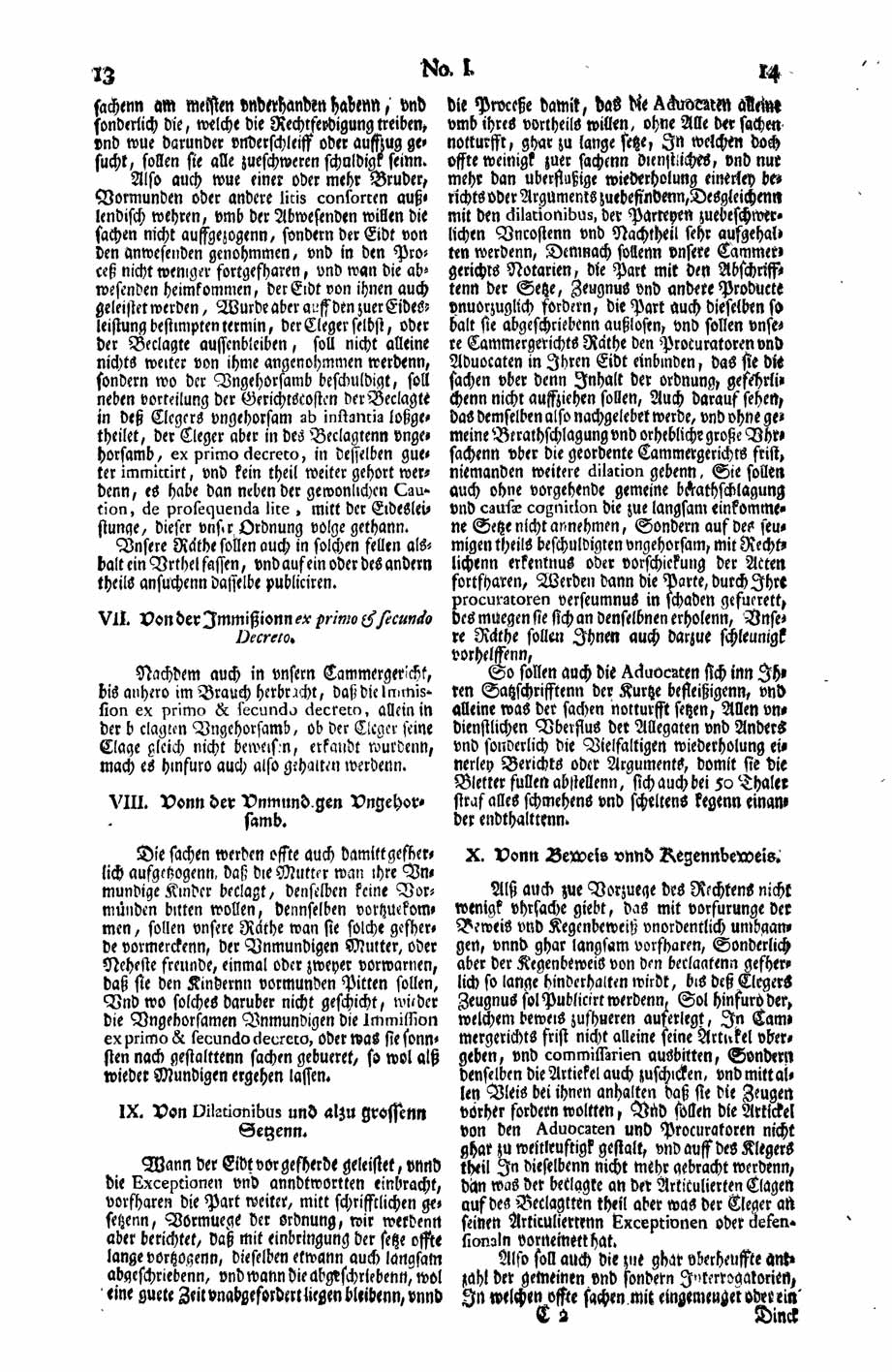 Wann der Eidt vor gefherde geleistet, vnnd die Exceptionen vnd anndtwortten einbracht, vorfharen die Part weiter, mitt schrifftlichen gesetzenn, Vormuege der ordnung, wir werdenn aber berichtet, daß mit einbringung der setze offte lange vortzogenn, dieselben etwann auch langsam abgeschriebenn, vnd wann die abgeschriebenn, wol eine guete Zeit vnabgefordert liegen bleibenn, vnnd [Sp. 14] die Proceße damit, das die Aduocaten alleine vmb ihres vortheils willen, ohne Alle der sachen notturfft, ghar zu lange setze, Jn welchen doch offte weinigk zuer sachenn dienstliches, vnd nur mehr dan uberflußige wiederholung einerley berichts oder Arguments zuebefindenn, Desgleichenn mit den dilationibus, der Parteyen zuebeschwerlichen Vncostenn vnd Nachtheil sehr aufgehalten werdenn, Demnach sollen vnsere Cammergerichts Notarien, die Part mit den Abschrifftenn der Setze, Zeugnus vnd andere Producte vnuorzuglich fordern, die Part auch dieselben so balt sie abgeschriebenn außlosen, vnd sollen vnsere Cammergerichts Raͤthe den Procuratoren vnd Aduocaten in Jhren Eidt einbinden, das sie die sachen vber denn Jnhalt der ordnung, gefehrlichenn nicht auffziehen sollen, Auch darauf sehen, das demselben also nachgelebet werde, vnd ohne gemeine Berathschlagung vnd orhebliche große Vhrsachenn vber die geordente Cammergerichts frist, niemanden weitere dilation gebenn, Sie sollen auch ohne vorgehende gemeine berathschlagung vnd causæ cognition die zue langsam einkommene Setze nicht annehmen, Sondern auf des seumigen theils beschuldigten vngehorsam, mit Rechtlichenn erkentnus oder vorschickung der Acten fortfharen, Werden dann die Parte, durch Jhre procuratoren verseumnus in schaden gefuerett, des muegen sie sich an denselbnen erholenn, Vnsere Raͤthe sollen Jhnen auch darzue schleunigk vorhelffenn,