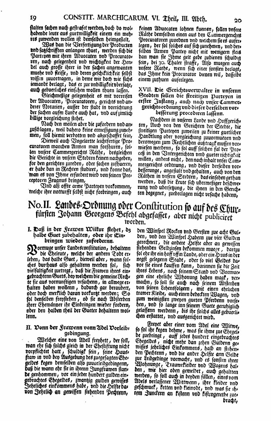 Vnd alß offte arme Parteyen vorkommen, welche ihre notturfft selbst nicht forbringen, auch [Sp. 20] keinen Aduocaten lohnen kunnen, sollen vnsere Raͤthe demselben einen aus den Cammergerichts Procuratoren zuordnen vnd welchem sie es auferlegen, der sol solches auf sich zunehmen, vnd derselben Armen Partey nicht mit wenigern fleis dan wan sie Jhme gelt gebe zudienen schuldig sein, bei 30. Thaler straffe, Also muegen auch vnsere Rathe, wenn sich einer sonsten beclagt, das Jhme kein Procurator dienen wil, dasselbe einem zuthuen auferlegen.